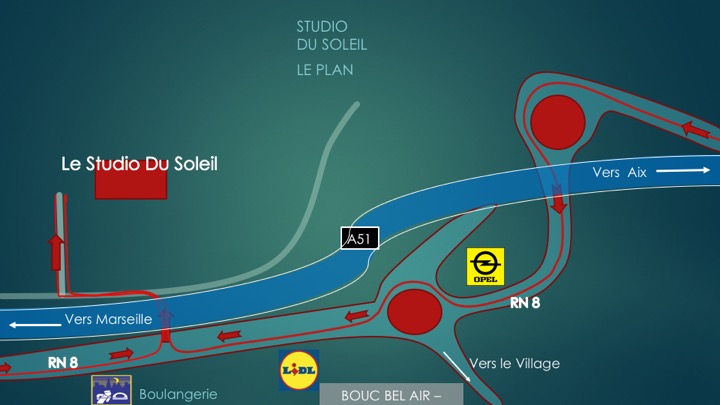 Si vous venez de Marseille par l’autoroute A51 ou par la RN8, sortir à Bouc Bel Air et suivre la RN8 en direction de Bouc Bel Air. Il faut rester sur la RN8 en direction d’Aix jusqu’au panneau « Quartier des Revenants » (environ 3 km), puis prendre à gauche.